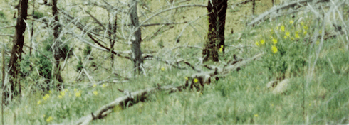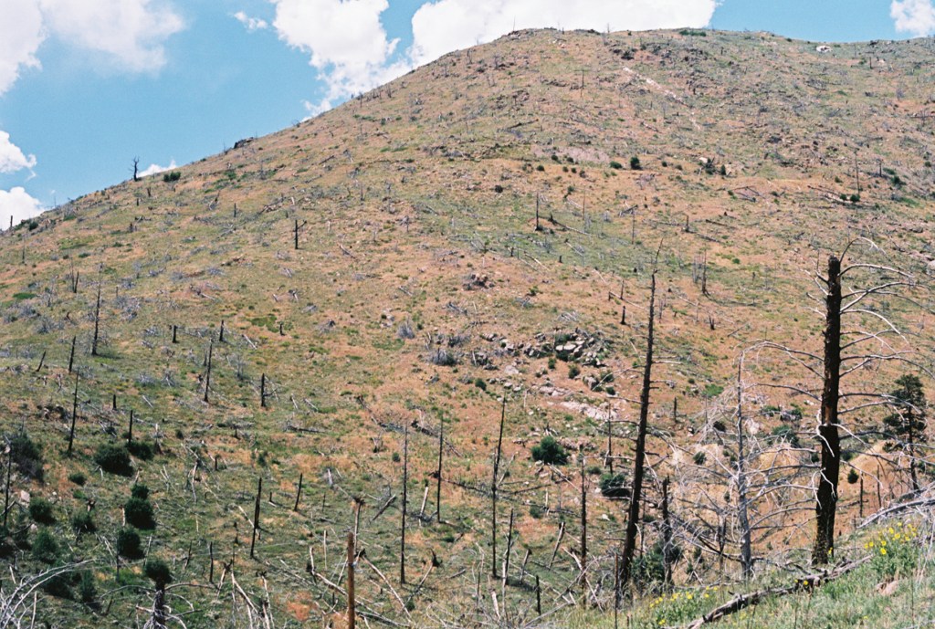 One of the first things I attempted, was slightly detaching the lens of the camera from the camera body, and then taking an image. I noticed that as soon as you unlock the lens from the body, the light meter will stop working properly, so meter your light first. The first shot I took was of a hill full of burned, dead trees. I took two identical shots, one with the lens attached correctly and one without.