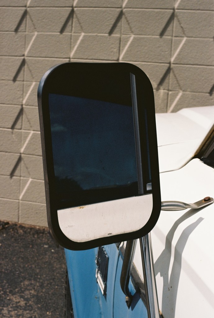 I attempted a shot using the mirror of an old truck to capture reflected light through the mirror, however, I found that the image in the mirror was far too underexposed in comparison to the rest of the image. Additionally, I wish that the mirror was framed better, as the tilted angle makes it hard to achieve any sense of harmony in the print. Of course, photographing the mirror dead-on would result in a print containing the image of your camera, but maybe there is a creative way to achieve this shot in a more harmonious way.