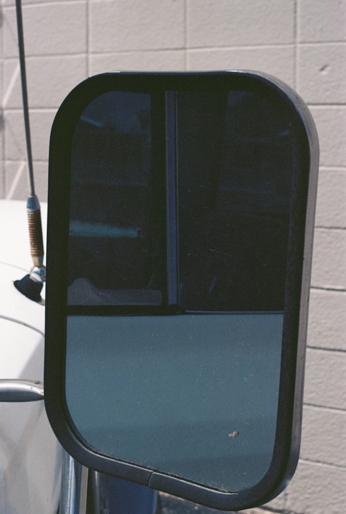 I wanted to particularly capture images from reflected light using this roll of film. I did my best to find reflection sources, but found the exercise to be extremely challenging. What I did find were several traffic mirrors, mirrors on old cars, and reflections in the rear window of my car.